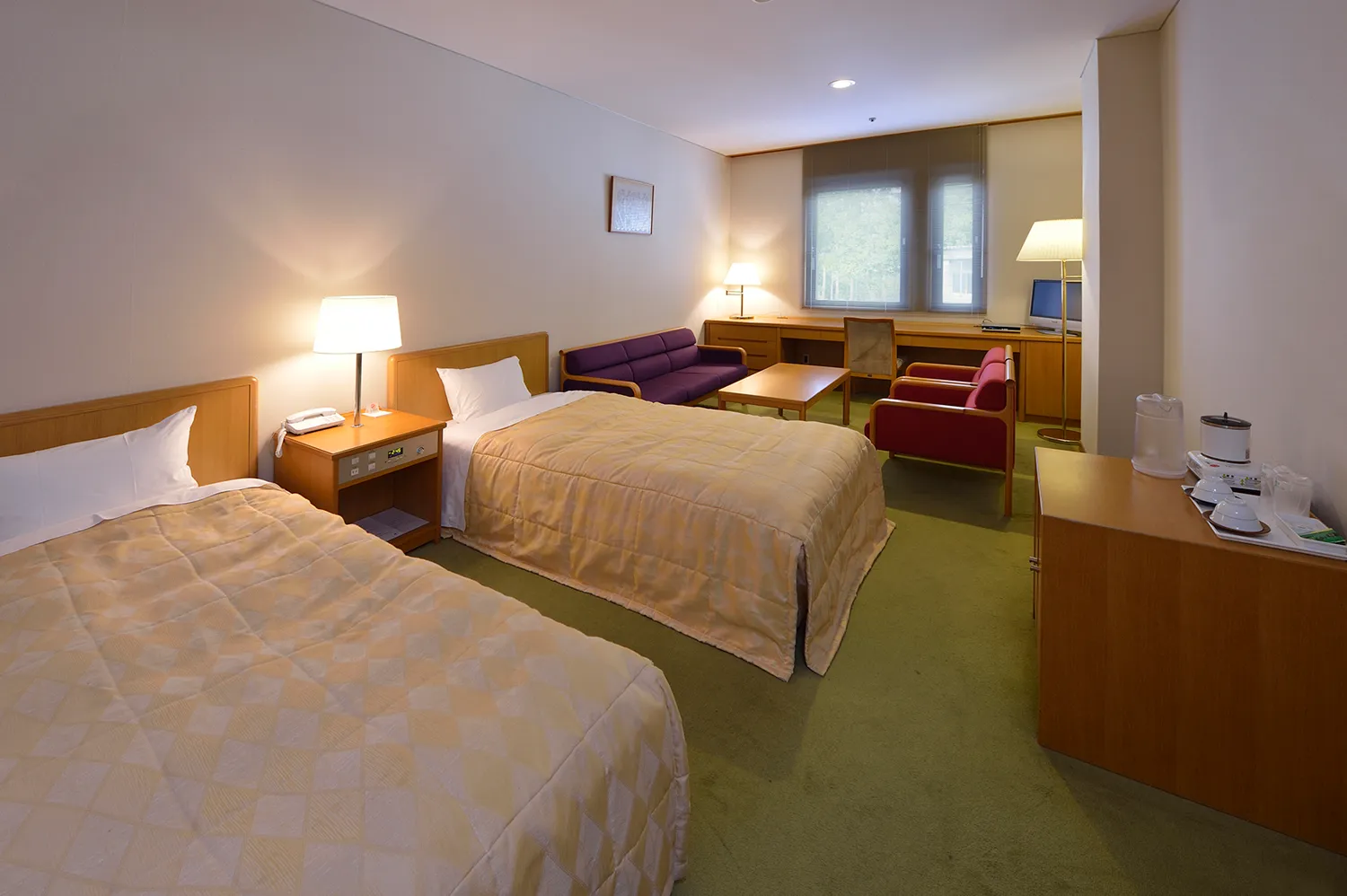 「ロッジ」は当館の敷地内(イベントホール東側)にあるため、朝から夜遅くまで作業をされる事務局・スタッフの方の宿泊に非常に便利です。また、観光名所や市内中心部にもアクセスが良く、一般のお客様のご利用も可能です。