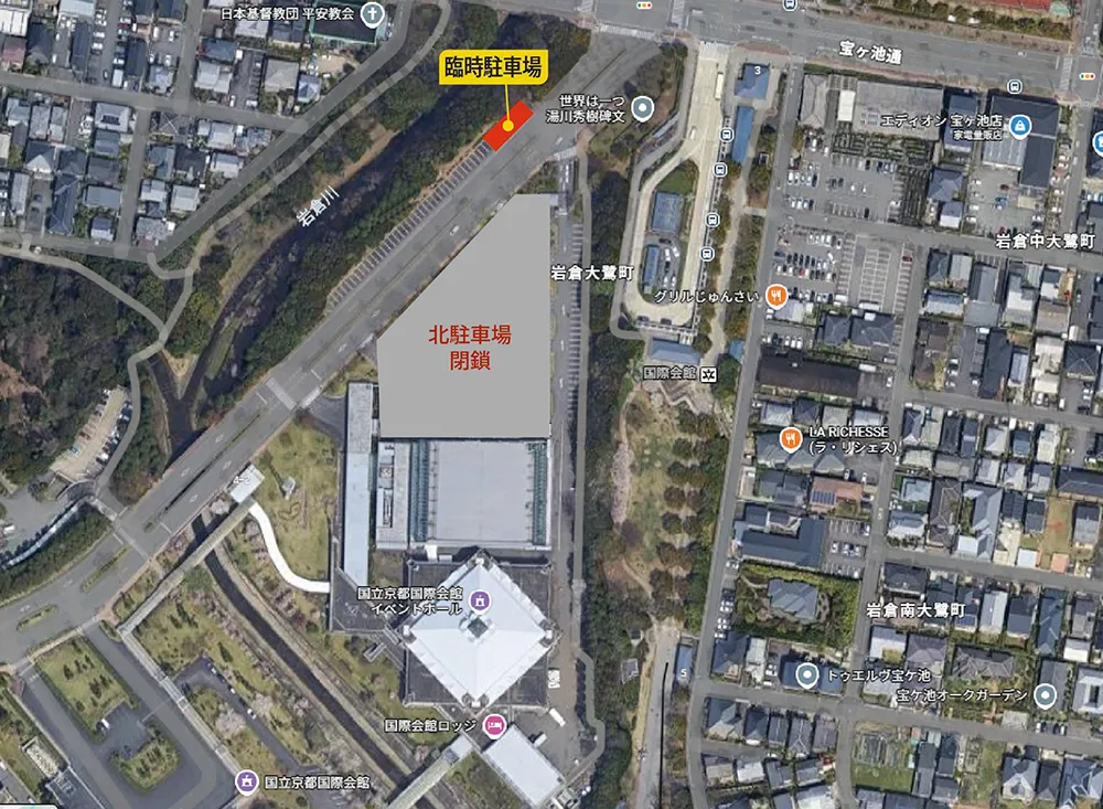 北駐車場が工事中となりますが、東側通路に沿ってお進みください。