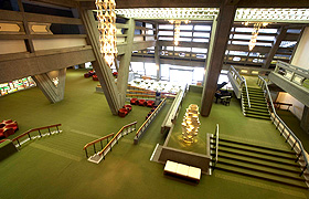 建物の約70%を占めるゆったりとしたロビーやラウンジなどのパブリックスペース。1階ラウンジより2階への階段途中からV字形柱を眺めてみると、力強い3つのVの柱の奥に輝く一筋の光が見えます。その光に天井から醸し出す間接照明の柔らかな光が相まって、ラウンジ全体の出す雰囲気は何とも言えないものがあります。外観の豪壮さから一転して、非常に落ち着いたものにまとめられています。