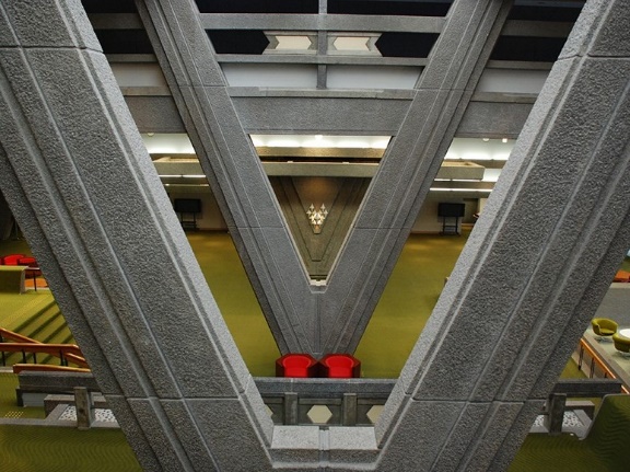 これは、設計者である大谷幸夫が、「大会議場は各国代表の空間、議長の空間、傍聴者の空間の三つから合成されるとすれば、都市の’広場’と同じような性格を持たせてもよいだろう」と考えたからです。議長、代表、傍聴、報道、運営といった様々な人々が集まるスペース。都市の広場が幾つもの異なった建築に囲まれているように、幾つもの空間から大会議場は創られているということです。
