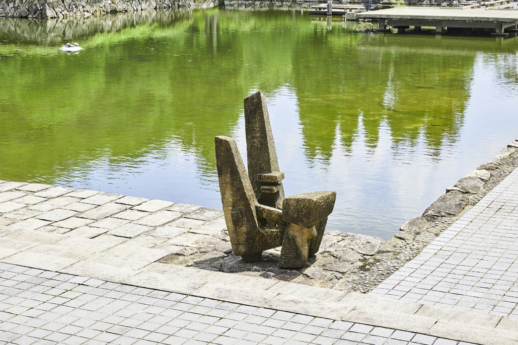 回遊式日本庭園にある池には、石の彫刻作品が4点配されている