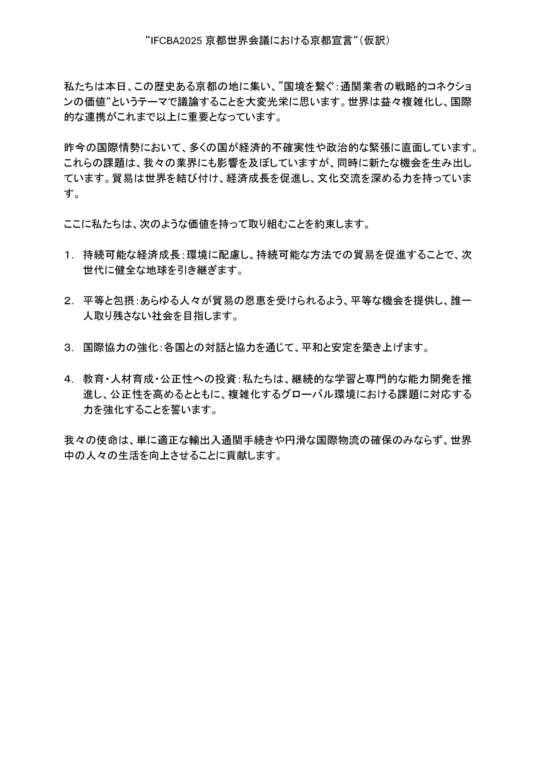 世界各国の通関業者や関係機関が一堂に会し、『国境を繋ぐ:通関業者の戦略的コネクションの価値』をテーマに活発な議論が行われました。会議の成果として採択された『京都宣言』は、貿易の円滑化と持続可能な発展を通じた国際社会への貢献を謳い、京都から世界に向けた力強いメッセージとなりました。
