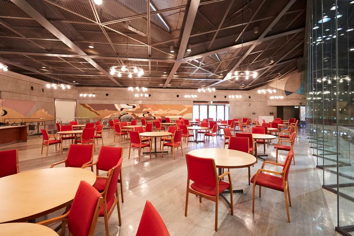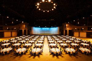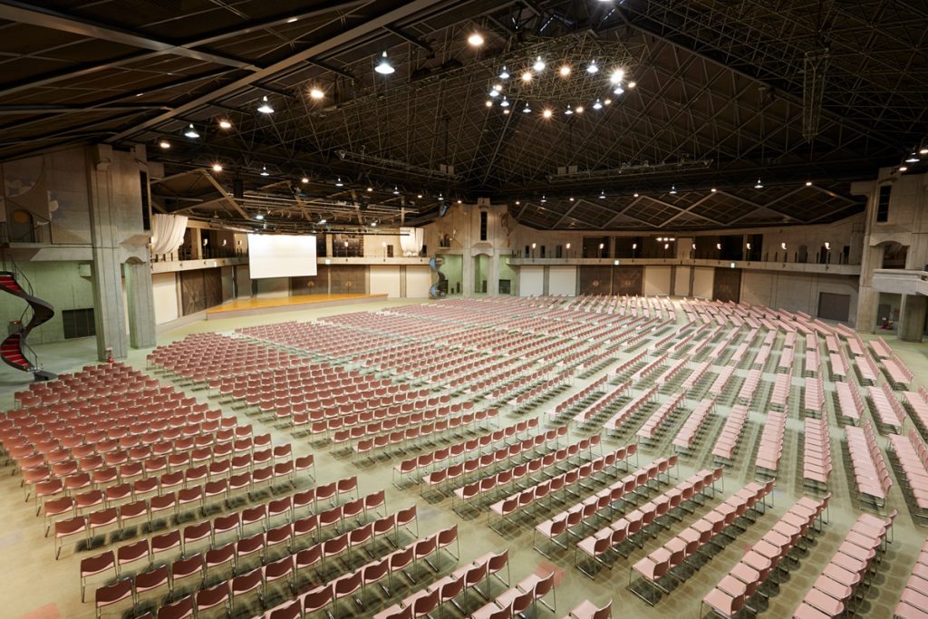本館と屋根付き専用通路で結ばれた3,000m²の大規模な無柱空間で、2,500名までの集会をはじめ、展示会などあらゆるイベントに対応する多目的ホールです。パーティー仕様では京都最大級の着席1300名・立食2000名の収容能力を誇り、ニューホールとの併用で2,000名までの会議とパーティーが隣り合う会場で実施いただけます。国際会館駅連絡口と直結した専用のエントランスも備え、イベントホール単体利用時の独立性も確保されています。